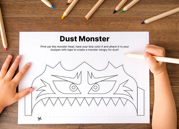 Make sweeping more interesting by turning the dustpan into a monster that is hungry for dirt and dust. Print out the dust monster printable, have your kids color it in then attach it to your dustpan with tape. Every time your kids sweep dirt into the pan, it’ll look like the dust monster is eating it up.